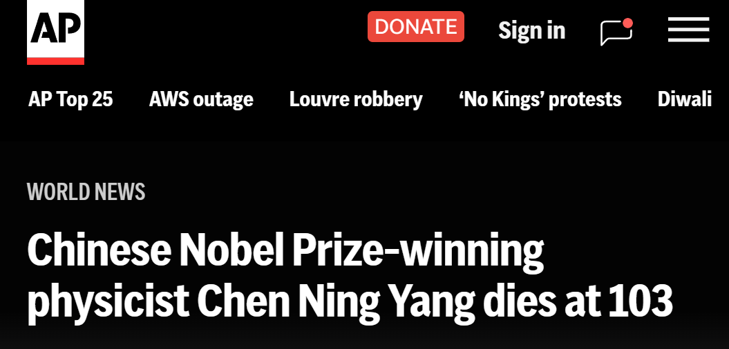 中国诺贝尔物理学奖得主杨振宁逝世,享年103岁